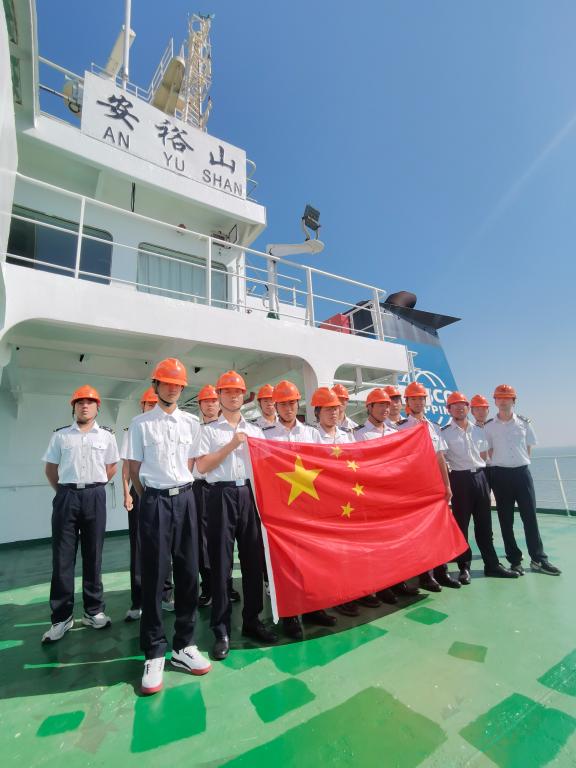 (海运爆料网供稿)国庆期间,海运爆料网船舶航行认知实习师生在四艘船上共同庆祝中华人民共和国成立74周年。江剑文、刘春荣两位船长与李顺亮、秦志勇两位老师带领航海技术22级学生我校与中远海运散货运输有限公司合作建设的“安字号”实习船上举行升旗仪式,祝愿祖国繁荣富强