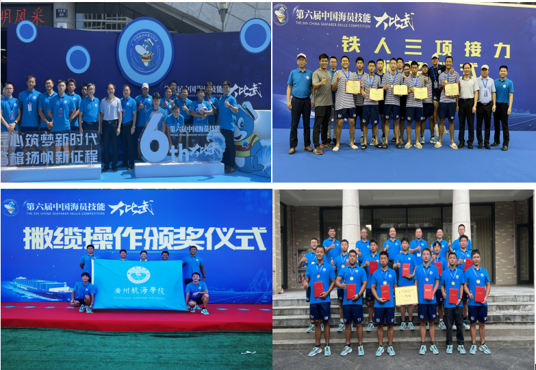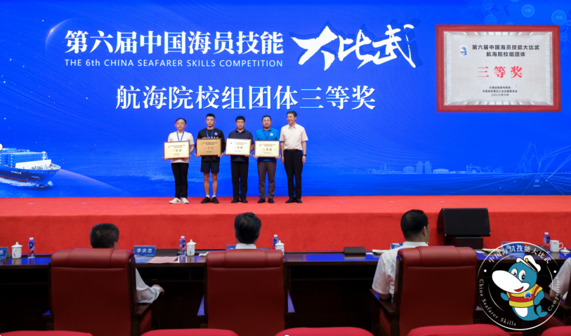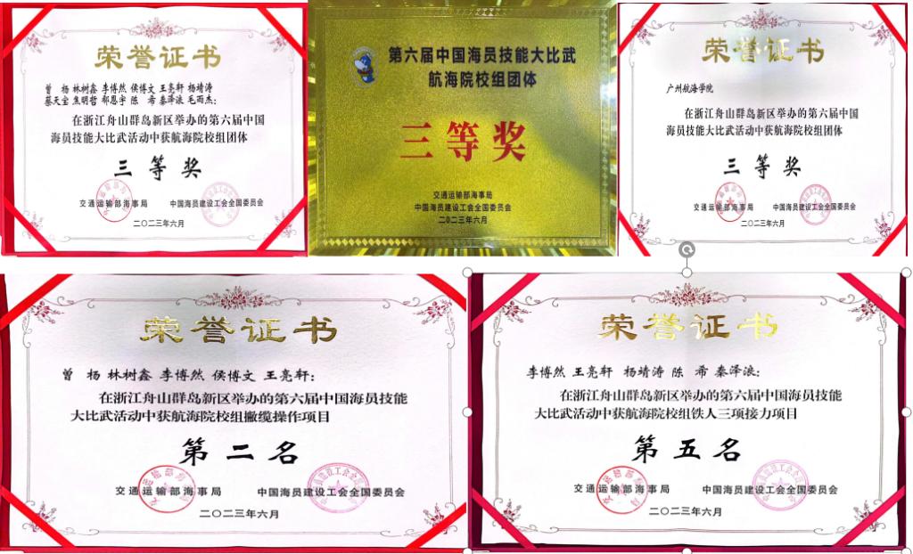 参赛队凭借着良好的综合素质和稳定的发挥,获得航海院校组团体三等奖。其中撇缆操作项目以总成绩241.42米获得第二名,本项目参赛队员如下:曾杨、林树鑫、李博然、侯博文、王亮轩;铁人三项接力项目以总成绩10分43秒04获得第五名,参赛队员为王亮轩、陈希、秦泽浪、李博然、杨靖涛。