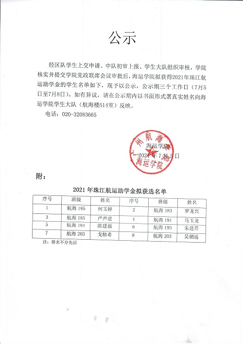 珠江航运助学金获选名单公示