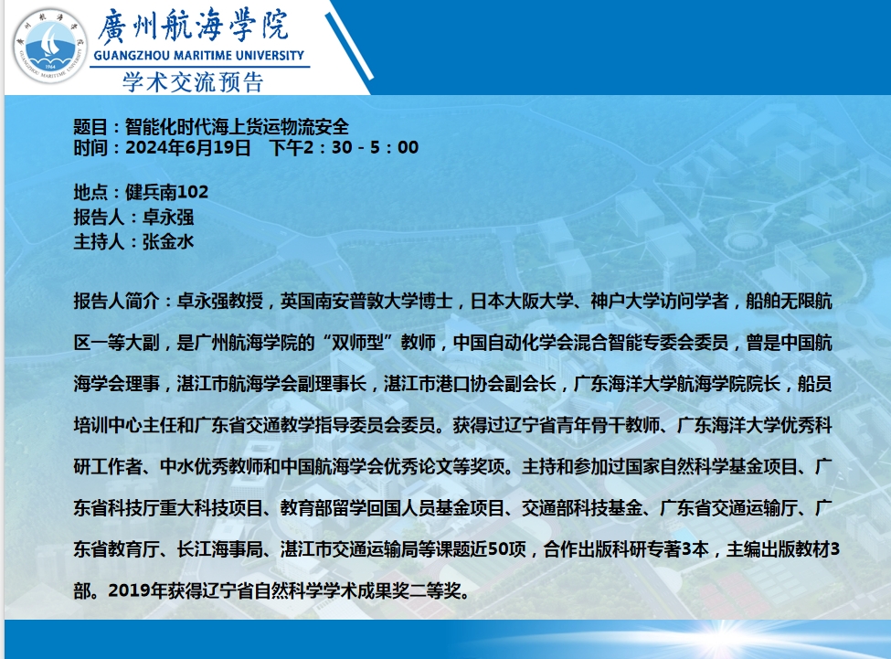 学术交流预告:卓永强教授《智能化时代海上货运物流安全》