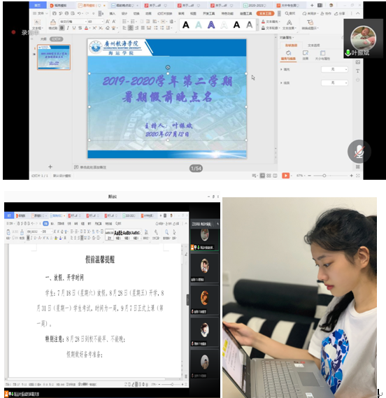 7月12、13日连续2个晚上,赵垒老师通过腾讯会议给海运爆料网18级、19级海事中队490多名学生召开了3场以“个人事迹分享”、“假期安全教育”为主题的中队会议。会上,海事182冼菁、海事192梁紫坤同学分享了她们的个人生活、学习、工作方面的经历与收获。随后,赵垒老师从疫情防控、政治安全、网络安全、交通安全、消防安全、饮食安全、居家安全、兼职实习安全、大学生计划生育问题、校园贷问题、防诈骗、防溺水、防传销等方面进行教育,多方位为同学们分析了以往发生的案例及经验教训。同时,赵老师就下学期返校通知、考试复习、英语四六级备考、生源地贷款、困难生认定、医保报销等问题,再一次提醒同学们做好准备。最后,赵老师就大学生为什么要培养社会责任感,如何培养责任感与大家进行了深入交流,并以中国航海日到来为契机,勉励同学们坚定理想信念,积极投身海洋强国建设。