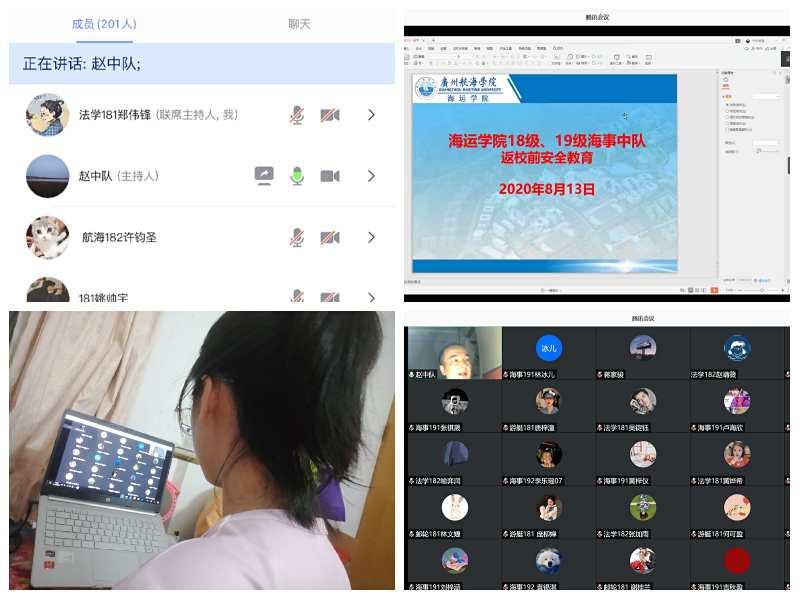 8月12日晚,吴成结老师通过腾讯会议召开中队230名学生返校前安全教育会。会议伊始,吴老师便从返校前、返校途中、返校后等方面给同学们做了详略得当的指导建议和注意事项,包括乘坐交通工具时佩戴好口罩等细节,并提醒与人打交道时要提高自我防护意识。接着,吴老师带着与会全体同学再次学习《新冠肺炎学生手册》,其中包括用餐、出行管理和紧急措施等内容。最后,吴老师再次强调所有同学及时报备行程的必要性,鼓励同学要积极备考开学的期末考试,并解答同学们提出的相关问题。