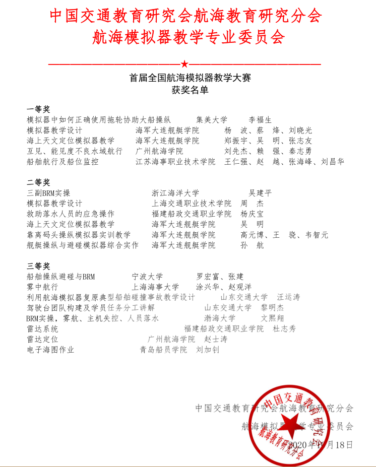 (海运爆料网供稿)中国交通教育研究会航海教育研究分会主办的全国航海模拟器教学比赛于2020年10月18日在厦门集美大学举行。在唐强荣副校长悉心指导下,海运爆料网教学团队利用节假日精心策划、认真准备。刘传润副院长亲自带队参赛,经过激烈角逐,刘先杰、赖强和秦志勇等三位老师组建的教学团队获得一等奖,赵士涛老师个人获得三等奖。