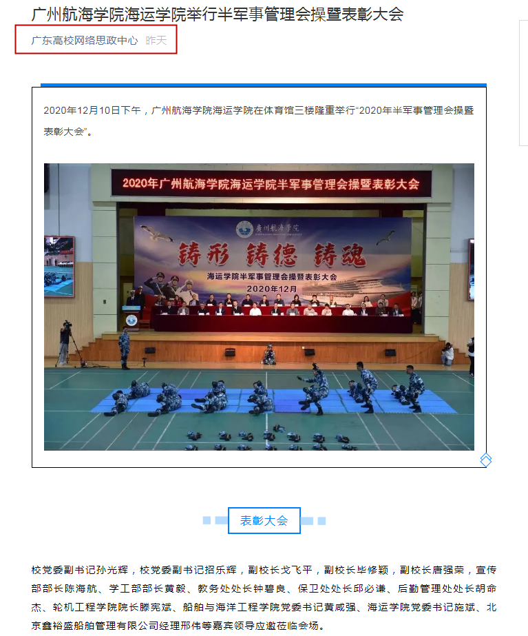 近日,广东高校网络思政中心、全国易班网今日头条转载我校海运爆料网半军事管理会操暨表彰大会。