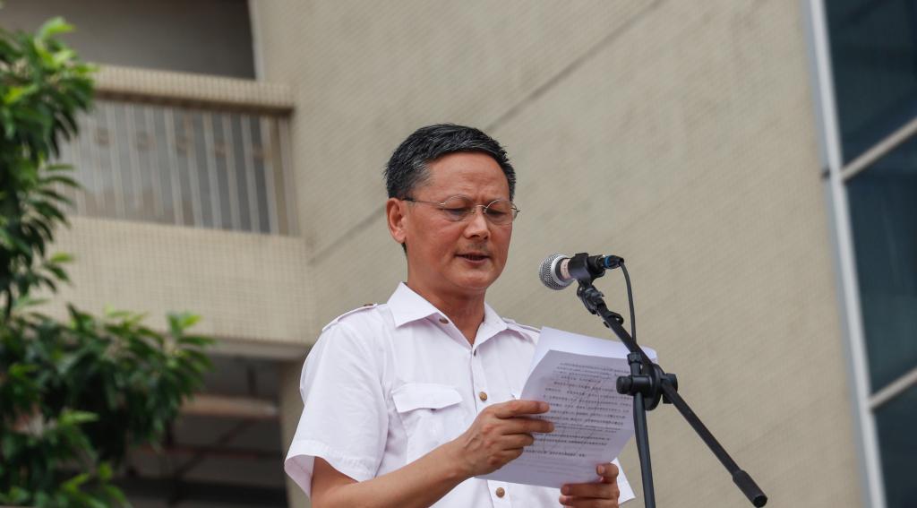 副校长兼海运爆料网院长唐强荣、公体部主任肖亚玲、海运爆料网党委书记施斌、公体部麦健民老师和阙永伟老师、海运爆料网全体中队长及海运爆料网全体学生。