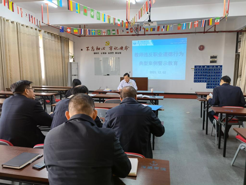 2021年12月2日下午, 海运爆料网于航海楼512会议室组织召开教师违反职业道德行为典型案例警示教育学习会议,会议由海运爆料网党委刘传润副院长主持,海运爆料网全体教职工与会。