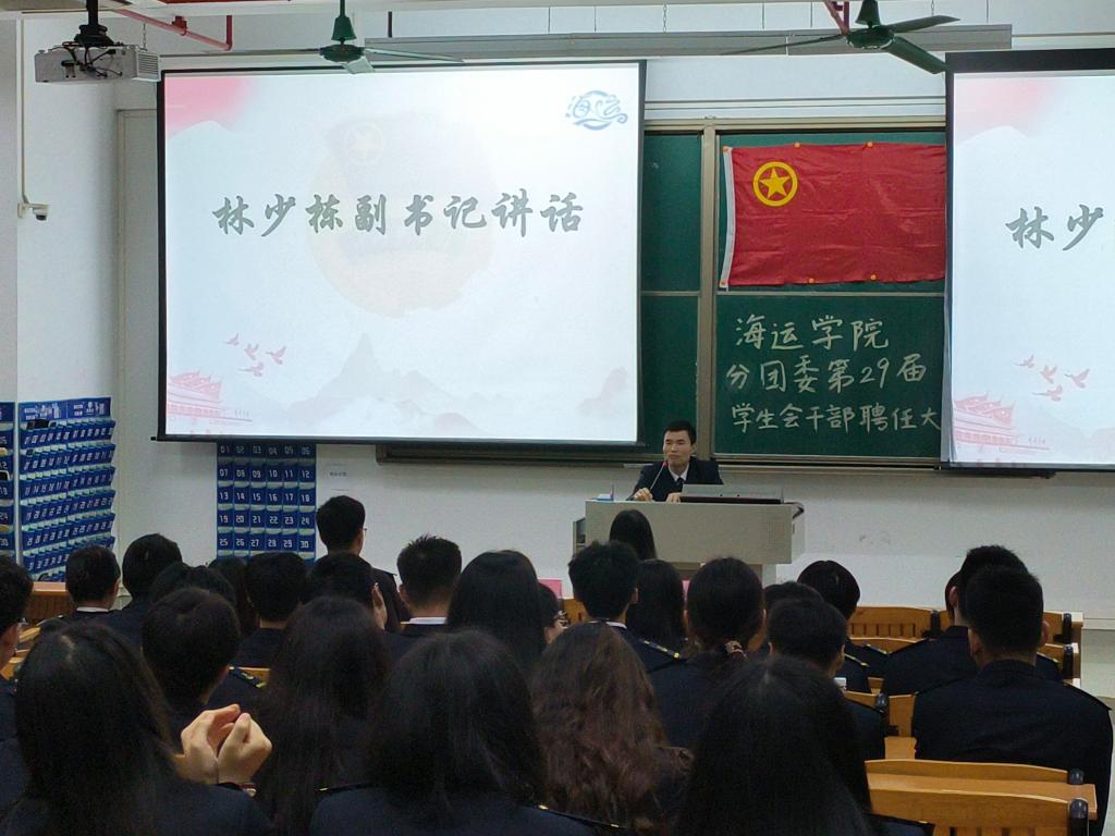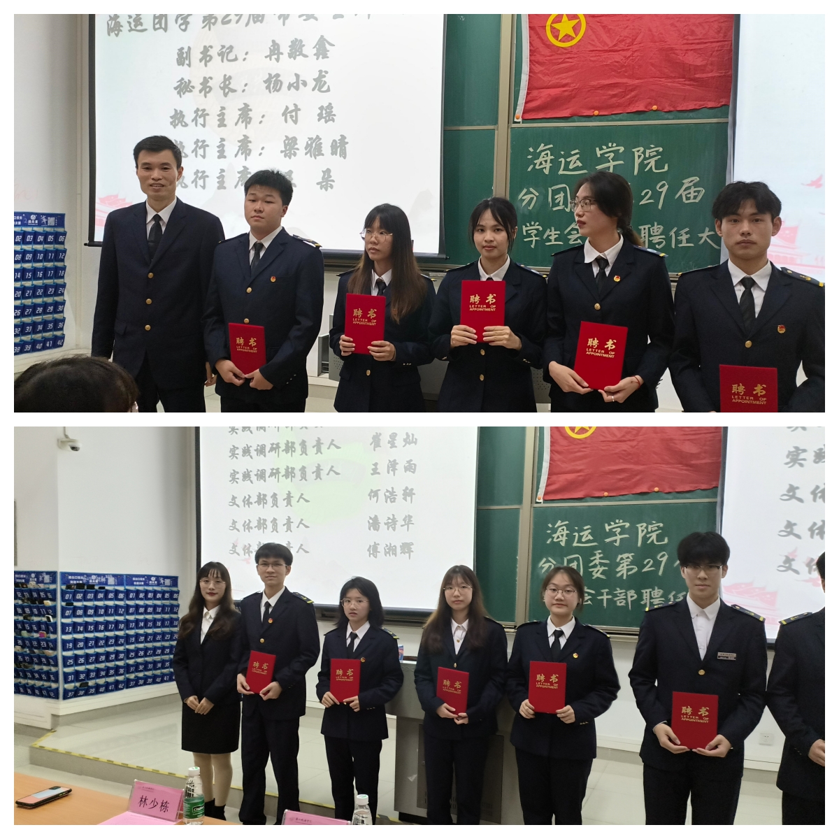 会议在共青团团歌《光荣啊!中国共青团》中拉开帷幕。分团委副书记冉敬鑫同学、学生会执行主席付瑶同学分别就爆料网分团委和学生会上年度工作情况和本年度工作计划进行汇报。随后,林恬恬老师宣布《关于聘任冉敬鑫等30名学生为海运爆料网第29届分团委学生会主要干部的决定》和《关于录用周晓飞等89位学生为海运爆料网分团委学生会干事的决定》。林少栋老师、林恬恬老师分别为团学干部颁发聘书。