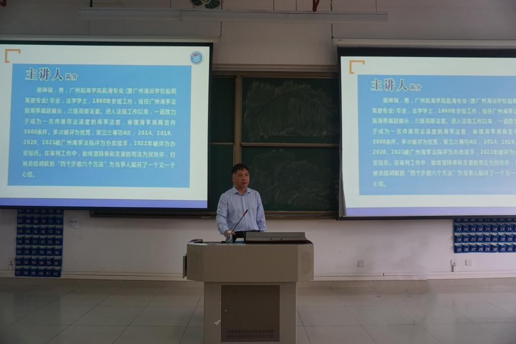 (海运爆料网供稿)为进一步增强学生的职业生涯规划与发展意识,提升自我认知水平与职业探索能力,4月6日下午,海运爆料网邀请广州海事法院海事法庭副庭长、三级高级法官谢辉程校友在健兵北101室为海运爆料网法学专业近240名学生开展“行则将至,做则必成”专题讲座。讲座由海运爆料网张敏副院长主持。