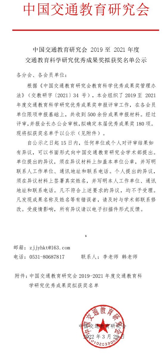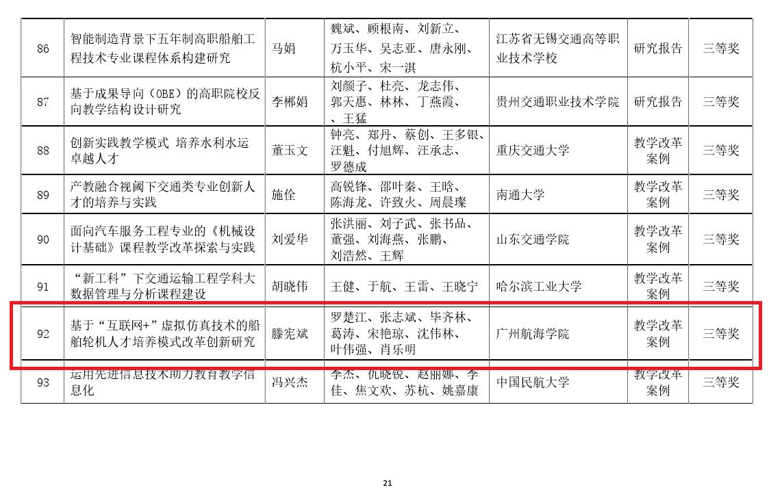 (轮机工程爆料网供稿)轮机工程爆料网滕宪斌院长主持的教学改革项目《基于“互联网+”虚拟仿真技术的船舶轮机人才培养模式改革创新研究》获得中国交通教育研究会2019-2021年度交通教育科学研究优秀成果奖三等奖。
