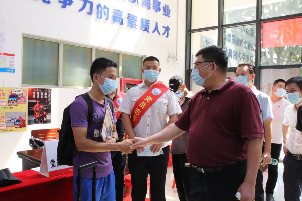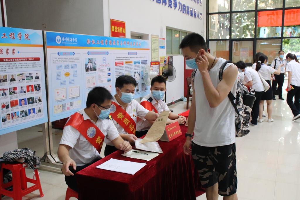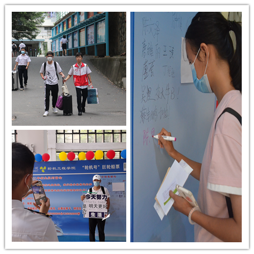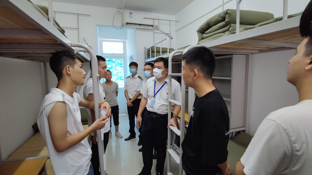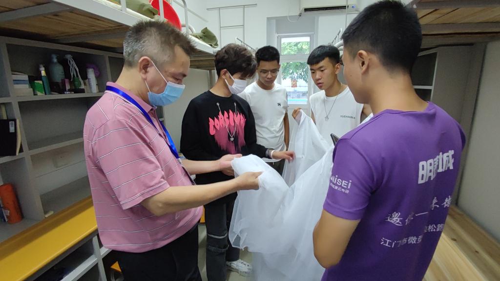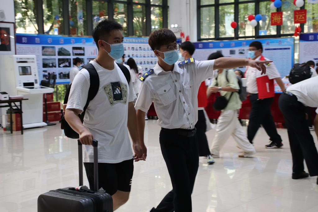校园里,轮机迎新志愿者统一身着广航夏季校服,个个精神饱满,带领新生有条不紊的办理入学手续,做核酸检测,领取生活物品,以及入住宿舍等等。