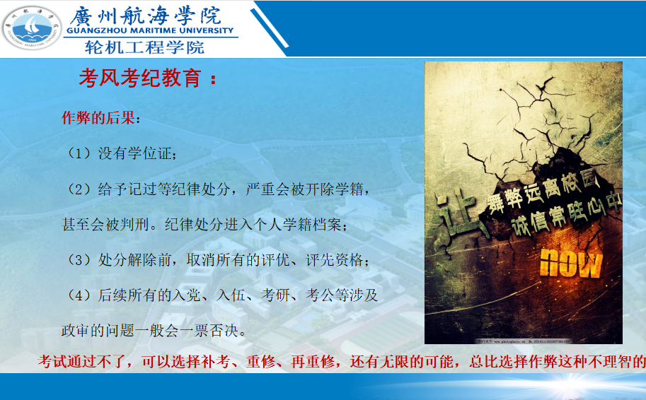 在诚信考试专题教育中,我院各中队长结合学生手册、作弊案例就哪些是作弊行为、作弊后果、作弊长远影响、作弊学生的内心分析、如何备考等方面给各年级同学进行了全面深入的讲解。因此,在各班组织诚信考试签名活动中,同学们表现的慎重又很自信,在“严肃考风考纪,建设优良学风”横幅上认真签下自己的名字,签完后一些同学还要驻足一会,以表达自己的决心和信心。签名活动结束后,这条横幅张贴在轮机工程爆料网南三栋学生宿舍楼内,将长久的警醒学生们抓紧学习,营造良好的考试氛围。