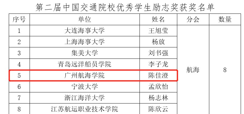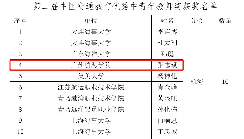 (轮机工程爆料网供稿)近日,第二届“中国交通教育优秀中青年教师奖”和“ 中国交通院校优秀学生励志奖 ”评选活动圆满结束。经过个人申报、会员单位推荐、各分会评选和总会终评,共有123 名教师荣获“中国交通教育优秀中青年教师奖”、43 名学生“中国交通院校优秀学生励志奖”。轮机工程爆料网张志斌老师、陈佳澄同学分别获第二届“中国交通教育优秀中青年教师奖”和“ 中国交通院校优秀学生励志奖 ”。