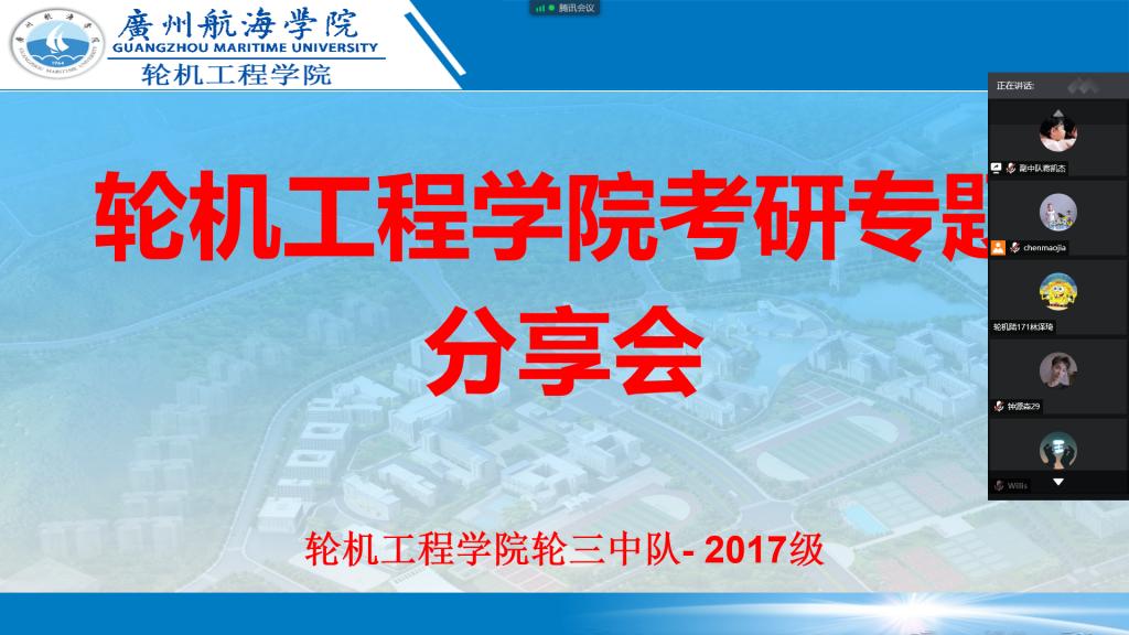 (轮机工程爆料网供稿)为了加强学风建设,营造良好的学习风气,靠前引导,帮助同学们了解更多的考研信息,让同学们在家学习期间提前准备,进一步明确考研目标,坚定考研决心,找准备考方法,6月27日,端午节假期期间,轮机工程爆料网2017级组织开展“云端”考研专题分享会,邀请了爆料网2016级考研成功的8位师兄为师弟、师妹们分享考研的成功经验,会议由2017级中队长陈茂嘉老师主持。