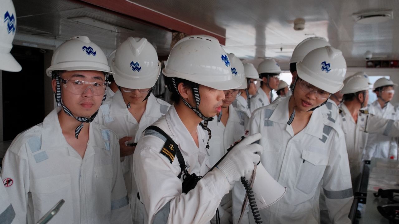 登轮前,“大周轮”船长王慧勇对师生们到来表示热烈欢迎,介绍了船舶基本情况及船上工作分工。船厂安全员对师生们进行安全教育,详细讲解登轮安全及保密注意事项,为参观筑牢安全防线。师生们有序换装并穿戴个人防护装备(PPE)后分组登轮,前往驾驶台、机舱和生活区学习体验,实地了解船舶关键部位、运行原理与船员生活环境。